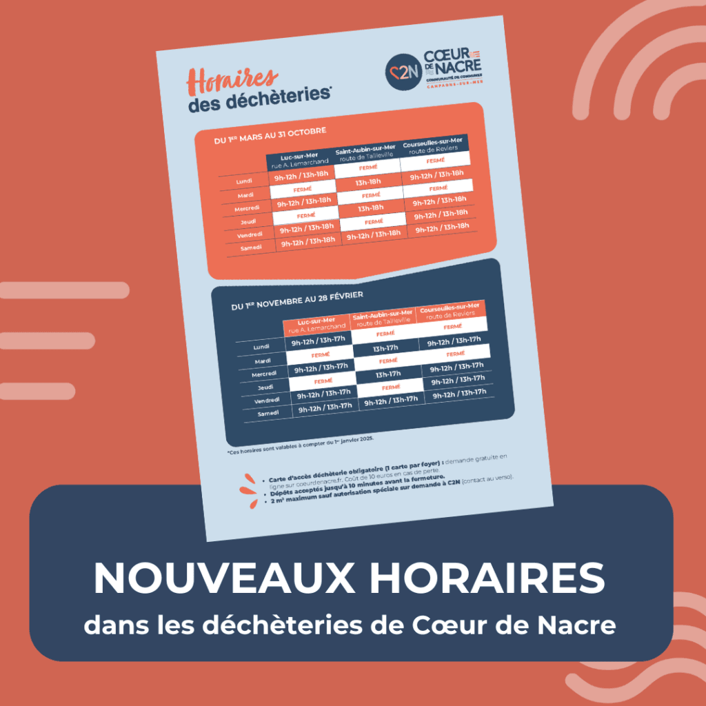 À partir du 1er janvier 2025, les horaires des déchèteries de Courseulles-sur-Mer et Luc-sur-Mer évoluent pour mieux correspondre à la demande des habitants du territoire.